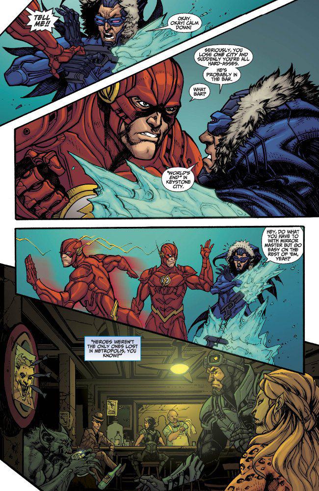 At times, the script rings untrue, offering shadow versions of scenes you'll recognize from other stories, without any real sense of referencial wisdom. They depict characters as slightly unfamiliar with each other, presumably to the expectation of an unfamiliar reader. This is evident in a bizarrely restrained interrogation scene between Batman and arch-nemesis Joker. Set immediately after the total annihilation of one of DCU America's biggest and brightest cities - Metropolis - it's all a bit shallow.