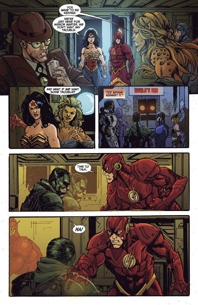 Rather than sell the virtues of enduring characters and their developed history, the popular wisdom of the day is to pitch lobbed soft balls. Deft writers can weave layers that satisfy new and old readers with the right sense of familiarity beneath a scene, but that isn't the case in Injustice #1 or #2.