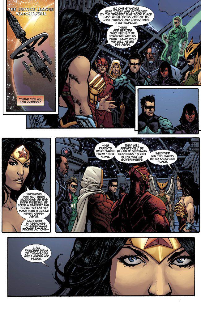 The ghost of Kingdom Come shrieks for attention during Superman's address to the world. Flanked by Wonder Woman; Superman has a less poignant message to spur in the final scene, but fair enough. It is what it is and as much as it would be nice to feel a sense of knowing in every panel, that's not what new readers want.