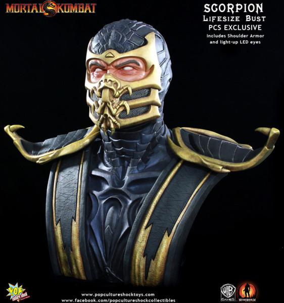Last July; Pop Culture Shock Collectibles announced the launch of a series of life-size busts based on characters from the hit 2011 fighting game: Mortal Kombat. Sub-Zero kicked things off [read more], becoming Mortal Kombat Online's most must-have item for Christmas 2012 [full story]. Now bare witness to the long awaited arrival of the next premium 1:1 scale statue - Scorpion!
