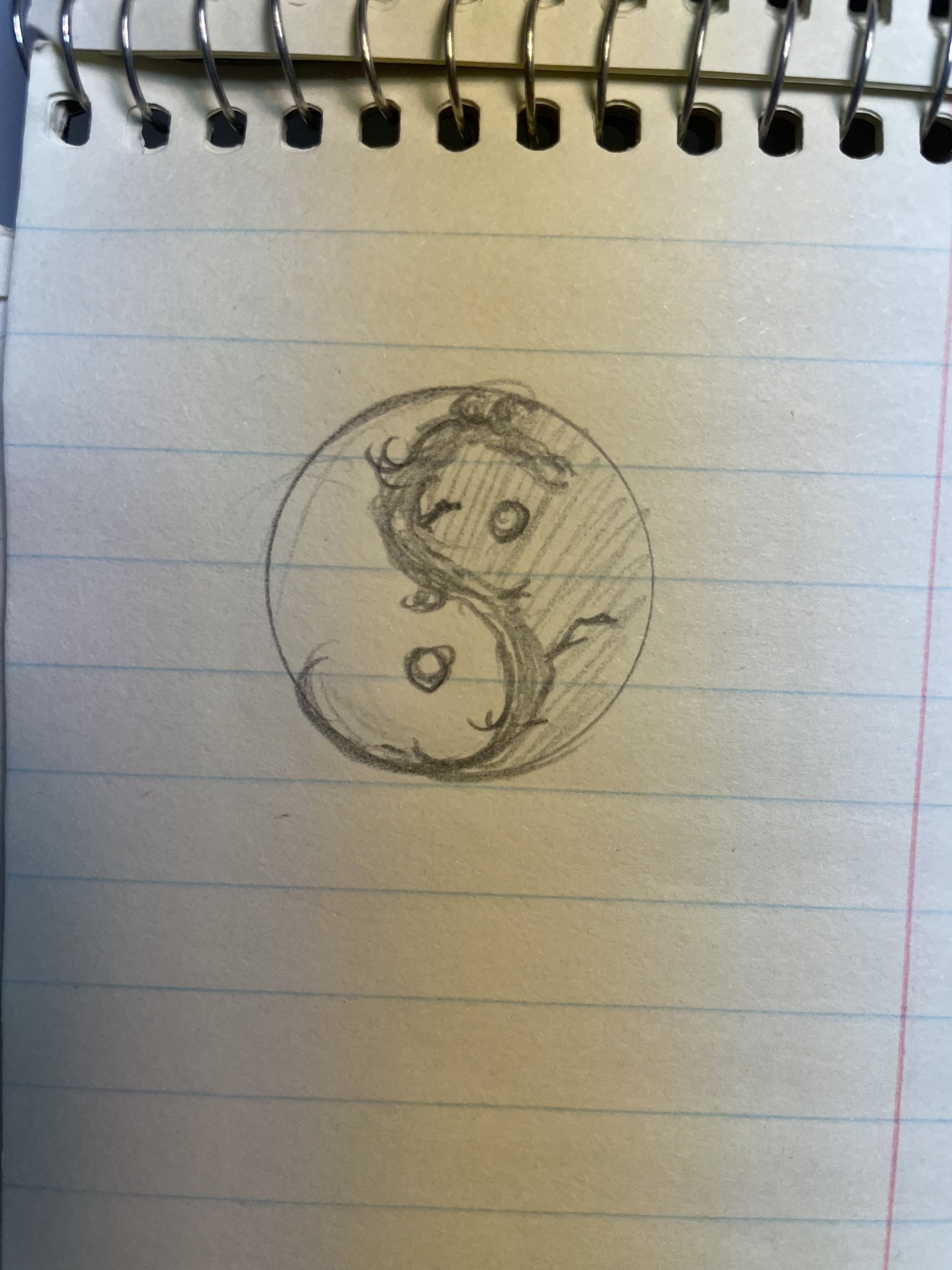 This tangled web may make it seem as if the finished product were fated to occur, but Tobias reveals the logo almost didn't happen! It was almost "tossed" when his sister mistook the side profile dragon head for a seahorse. His earliest "doodle" [pictured below] shows a more complete dragon dividing the halves of a yin yang symbol in reference to the "balancing of the furies" included in early lore.
