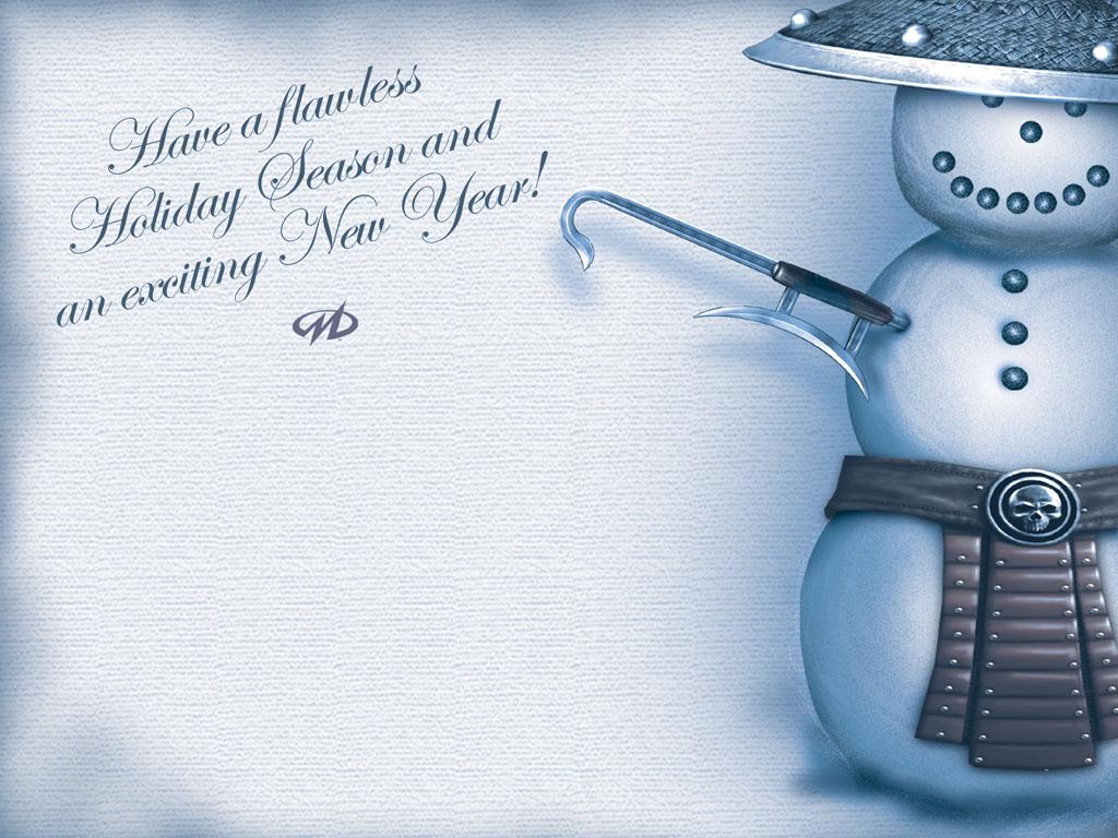 Over a background of white snow rests a snowman decorated in various gear from Mortal Kombat characters such as Raiden, Kabal and Scorpion. In the top left hand corner a cursive inscription reads "Have a flawless Holiday Season and an exciting New Year!"; underneath is the Midway logo.
