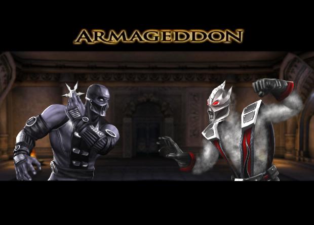 Noob Saibot and Smoke preparing to fight in what appears to be the Shaolin Temple from Mortal Kombat 4. Finally, the MK icon himself, Scorpion, battles the oldest returning character in the game, being absent wise, Kintaro (the arena may be The Tomb, originally from Mortal Kombat 2).