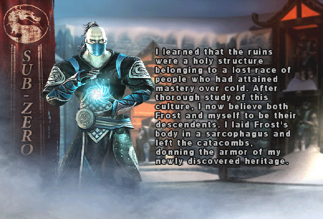 The design sensibility of the Katakombs has been echoed in subsequent appearances of the Lin Kuei Palace in Armageddon and Mortal Kombat X, all seemingly drawing inspiration from the open MK4 Ice Pit arena. The Katakombs can also literally be seen in the background of Sub-Zero's second MK Deception character bio [pictured below].