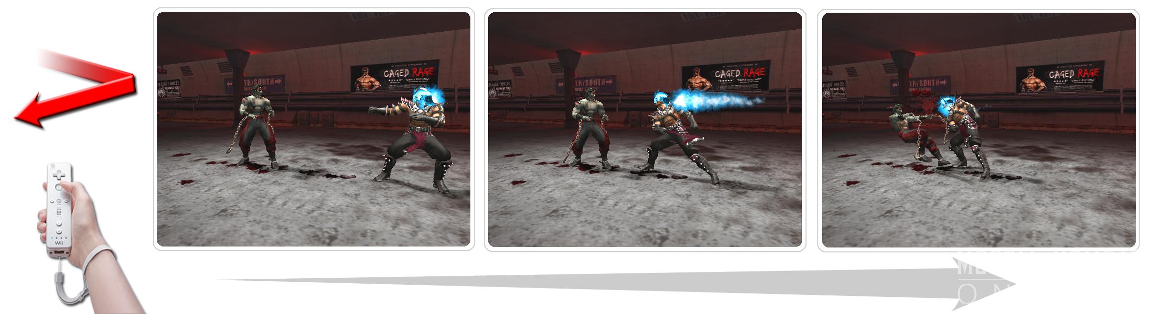 The folks over at Midway have decided to give out another set of screenshots from the upcoming Nintendo Wii version of Mortal Kombat: Armageddon! Two of the screenshots show regular kombat action: one has Reiko using his charge attack against Liu Kang, and the other shows Sektor using his flamethrower against Cyrax. The other three images demonstrate how the Wii remote would be used to implement such attacks; two images show the Wii remote motions needed for each attack, and one image shows a three-panel demonstration of Reiko's charge attack in motion.