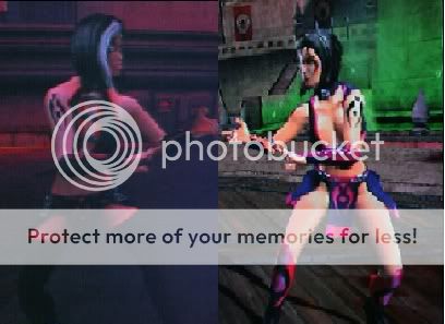 Alternate: not a HUGE change to the primary, her alt is her costume from MK Tournament edition (i think) and its a black and purple/pink bikini kinda thing with a flappy-thing kinda like the ninjas, but its pink/purple and black with a pink/purple symbol on it... and she has boots and arm things.. yeh..