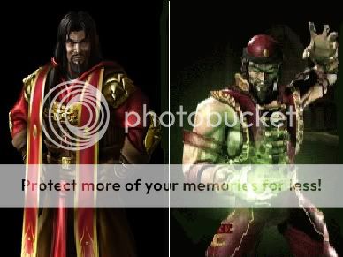 Alternate: for some reason this reminds me of his MK3 costume.. um, he has his MK2 hat thing but red, some weird red vest thing... arm bands and wrist things... and funny red pants with golden dragon pictures on 'em...