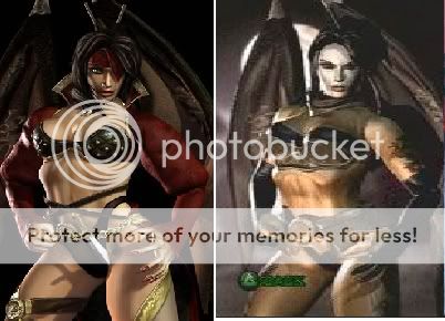 Alternate: um.... she has a white face for some reason... black with gold metal bikini thingy. uh, long black gloves. her wings are a tiny bit different i think. and awesome big KISS boots! they like have a devil face thing on em'