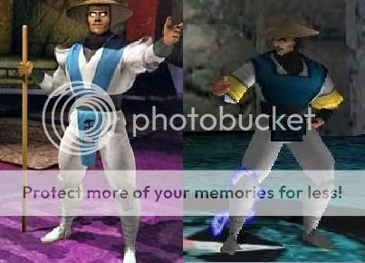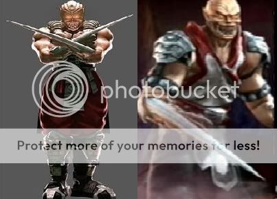 Alternate: pretty much his MK2 costume, he has kinda like a white singlet thing with red on it... metal shoulder things spiky armbands, the swords (duh!) the triple flappy thing but... white...and different, black oants red belt and..yeh..