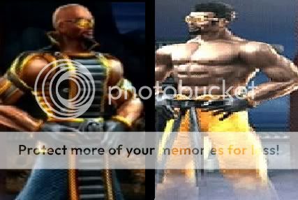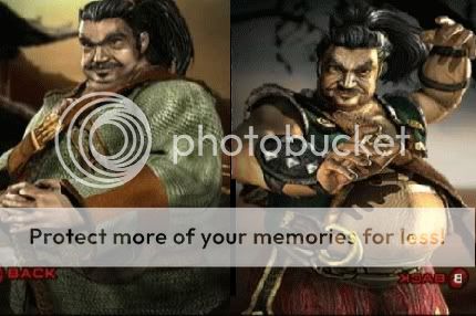 Primary: the gayass one from his MKD alt... uh, he has a moustache and goatee thing... hes fat... hes wearin' some stupid brown and creme-ish outfit... uh black shoes i think.. yellowish pants... and... its weird.
