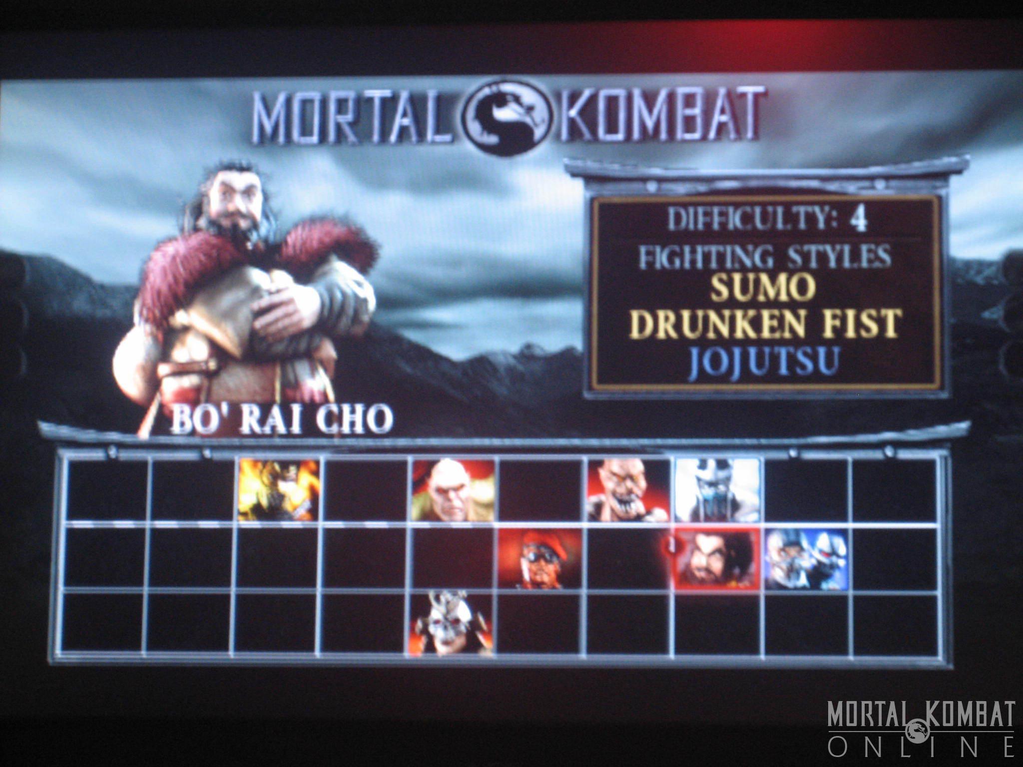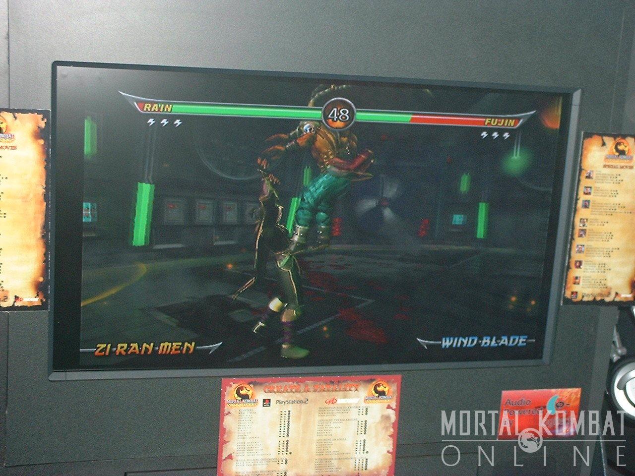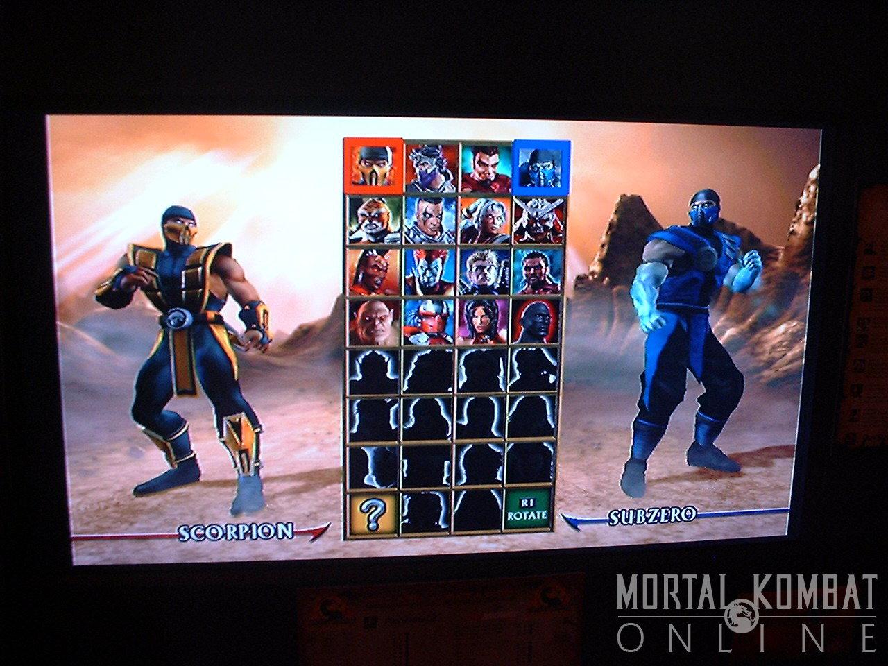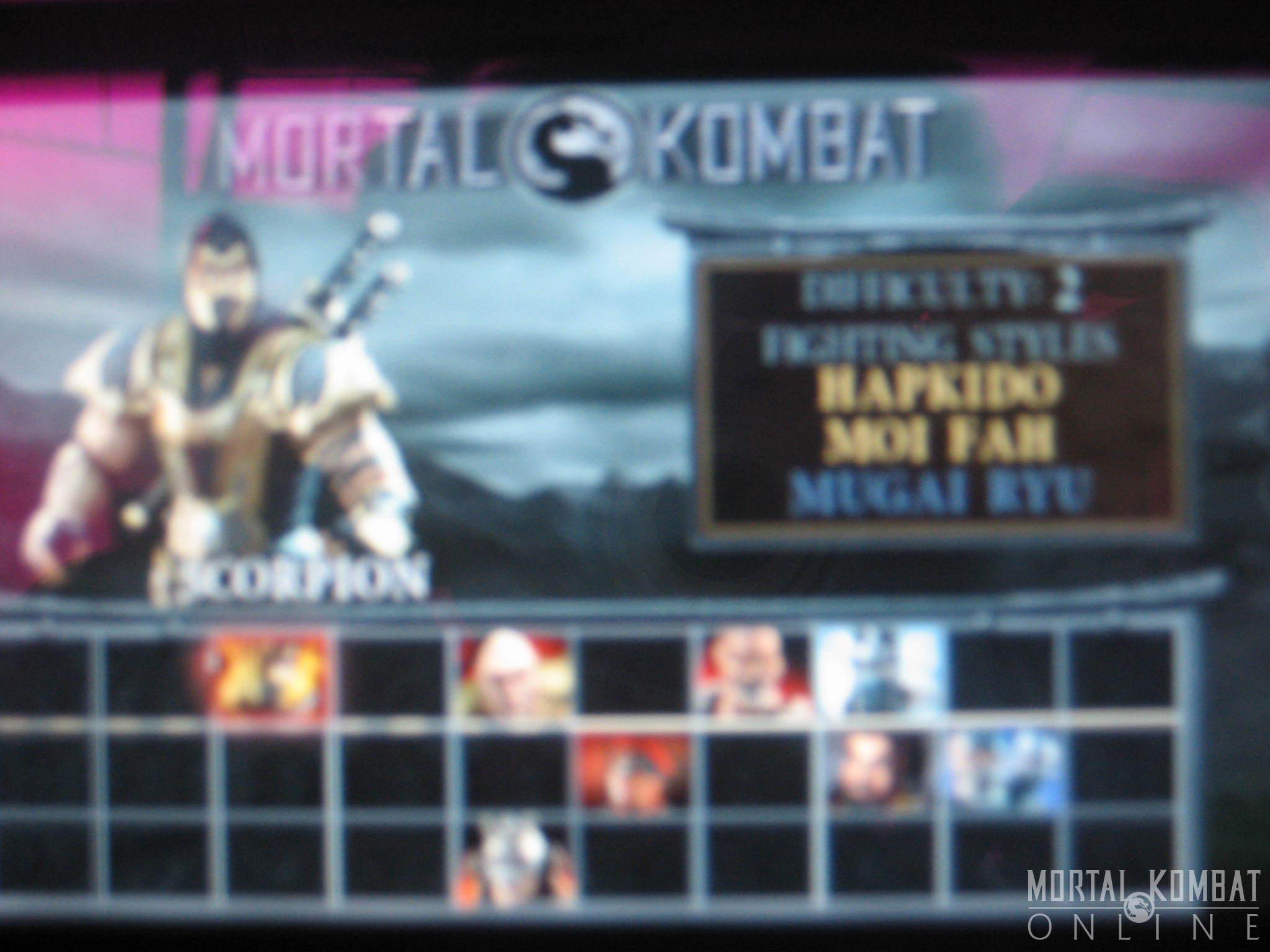The character select screen had the following characters available - Scorpion, Rain, Jarek, Sub-Zero, Kintaro, Reiko, Fujin, Shao Kahn, Sheeva, Shinnok, Stryker, Kai, Goro, Sektor, Sareena, and the custom character (named "Kombatant" by default). There were a lot of characters who were darkened out because they weren't available in this build - so much so, that an extra button for "rotate" was added to access the additional characters. On the versus screen, Blaze is shown in the beginning and appears to be much bigger and stronger than he was when he was last seen in MKDA. One wonders if he was somehow merged with another being like Reptile was in MKD when Onaga used his body as a vessel.