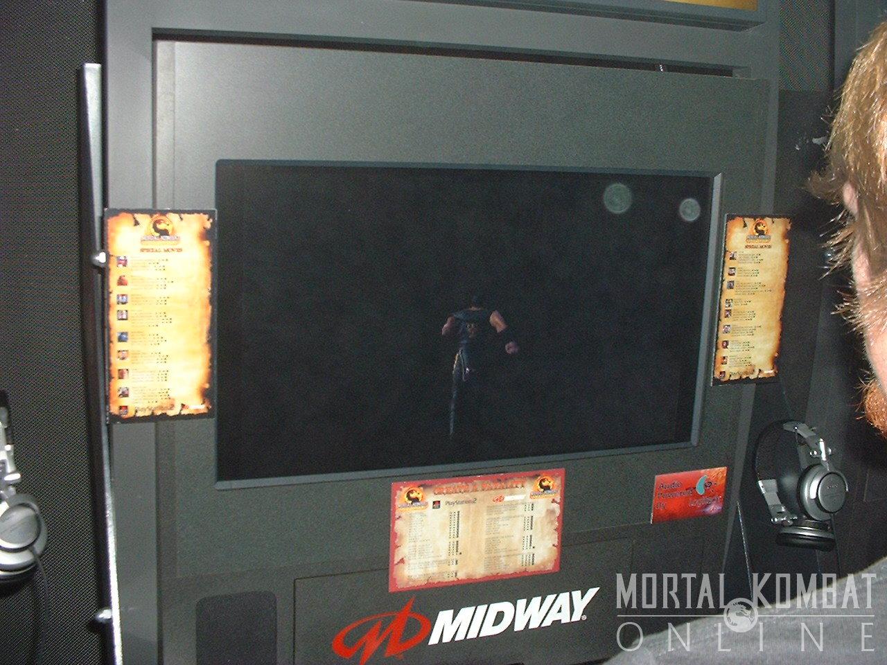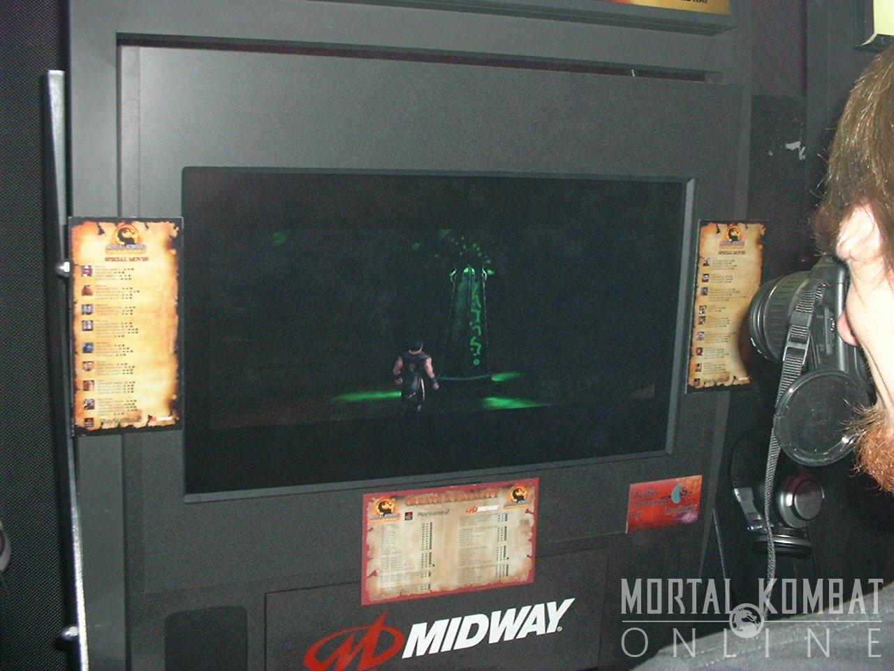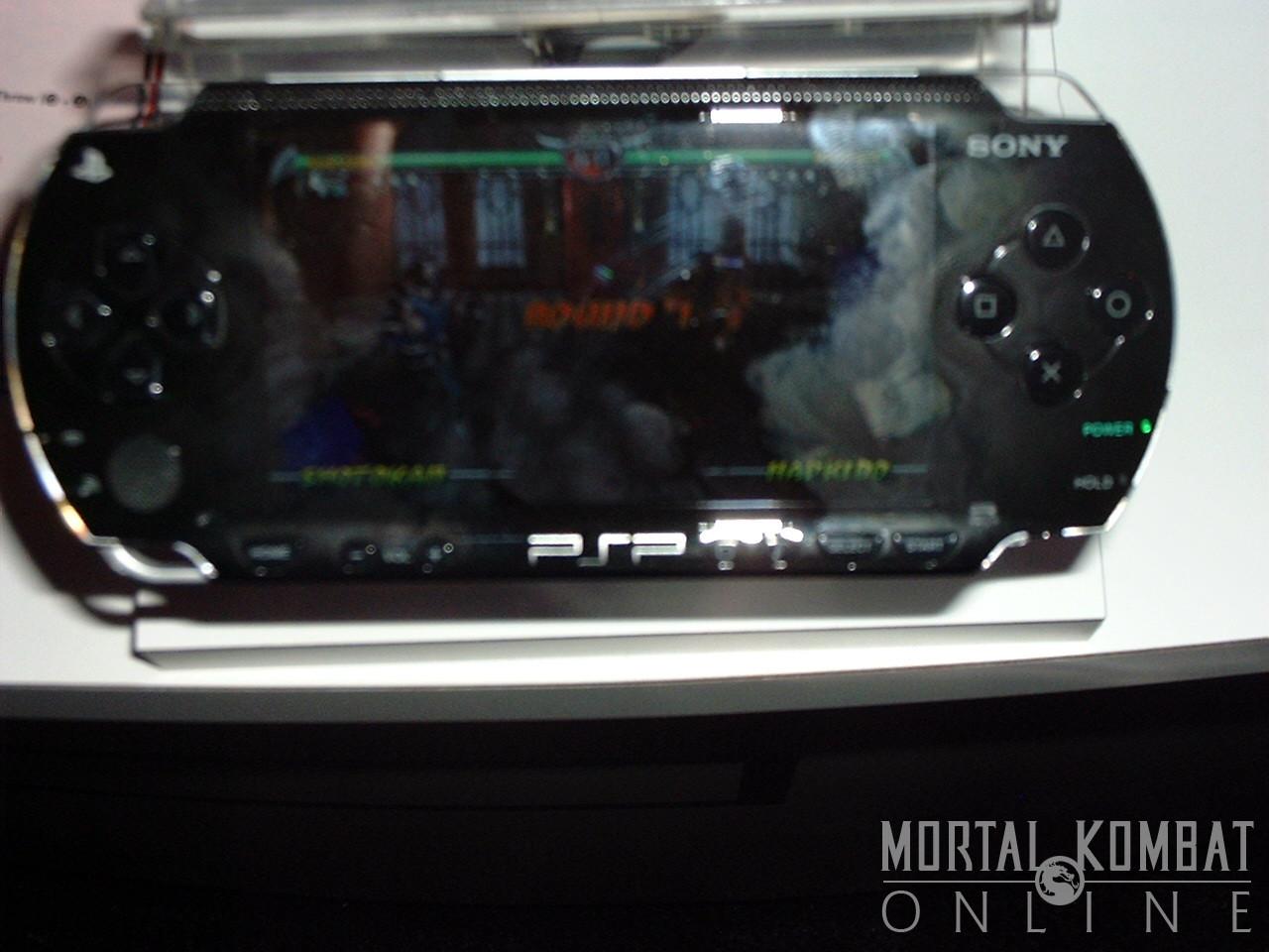 Finally, we got a chance to play MK Unchained on the PSP. There were only a couple of characters available - Scorpion, Goro, Shao Kahn, Noob-Smoke, Baraka, Sub-Zero, Jax, and Bo Rai Cho. They seemed to play just like normal as in MKD, and the graphics were much more crisp than expected. The FMV intro is here in all its glory. And wireless mode is working great! There is one problem where pausing the game doesn't stop the action from going - your opponent isn't stopped form playing and will therefore beat you mercilessly. Other than that, it seems like a perfect translation of MK Deception and will, in fact, be better when they add the exclusive characters to the roster.
