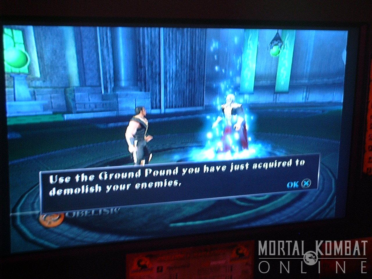 As is well known, Armageddon uses an updated version of the fighting engine used in Deception. Unlike the last fighting game installment of MK, however, there is only one hand-to-hand fighting style and one weapon style per character. This is a logical move, as there are too many characters planned for each one to be able to have two unique fighting styles. Sadly, this means an absence of style-branch combos which were very powerful in Deception, but on the plus side, it's now a lot easier to get out your weapon. The breakers from Deception are back as well, and are even able to be used on aerial moves. In fact, Aerial Kombat is pretty intense, as combos of punches and kicks and even throws can be done on an opponent who is airborne. The little light indicators from MKD near the energy bars are gone; though yellow and red indicators in the arenas still reveal where the traps are.
