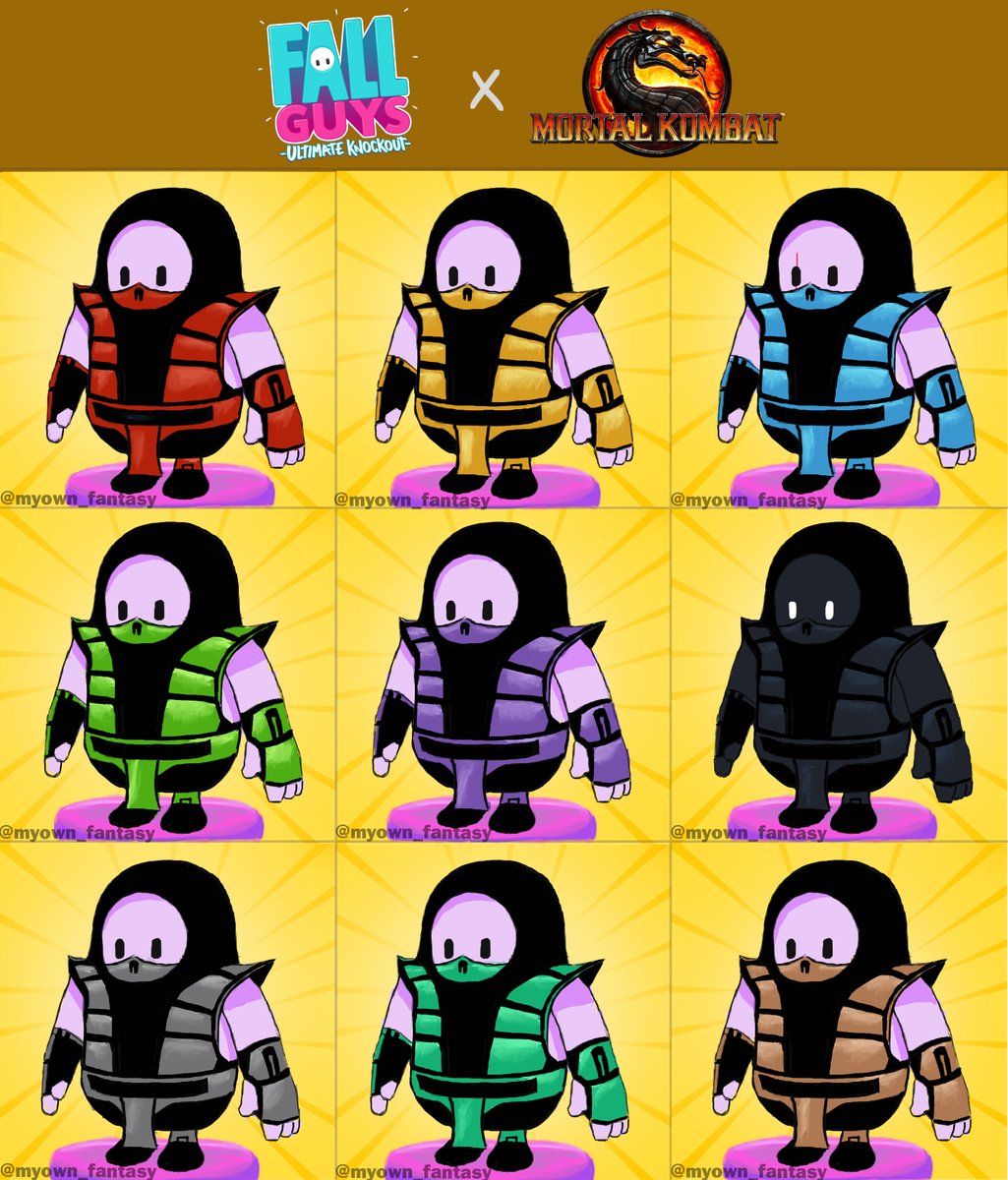 Characters can choose two-tone color palettes and patterns unlocked in Fall Guys, but Salsa envisions a rainbow of Mortal Kombat characters inspired by the klassic design. From top to bottom, left to right, they are: Ermac, Scorpion, Sub-Zero, Reptile, Rain, Noob Saibot, Smoke, Chameleon, and even Tremor!