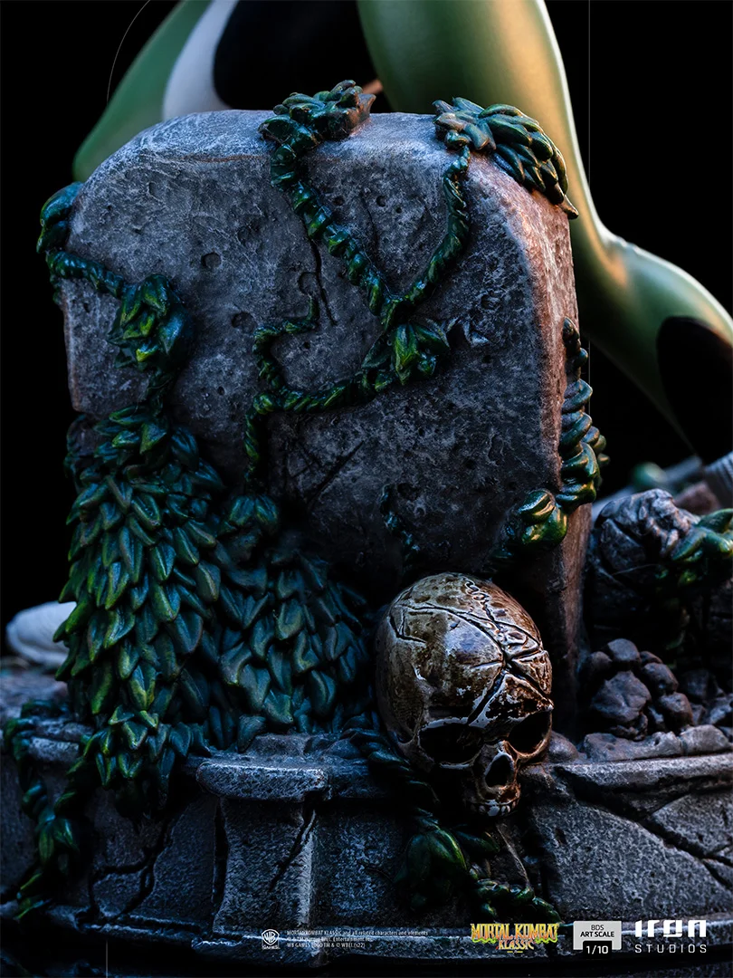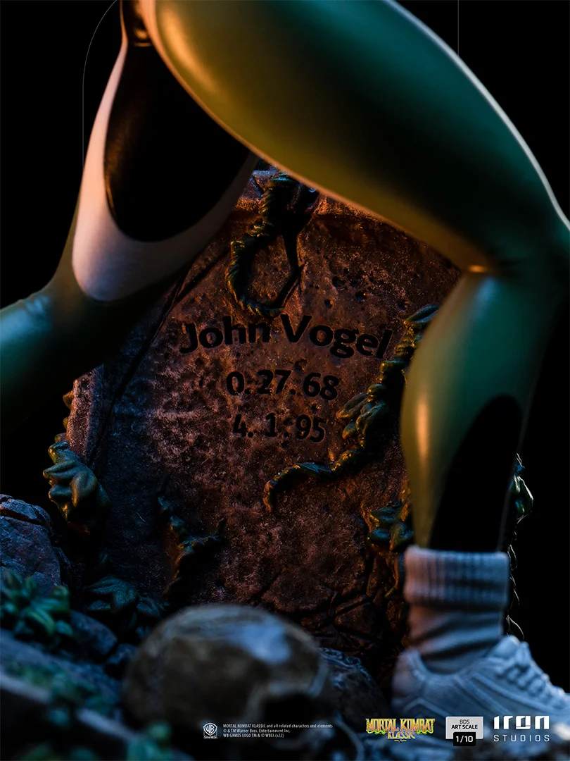 Sonya takes a walk among the tombstones in the 1/10th scale statue, which brings to life both her "Kiss of Death" fatality, and a portion of the Graveyard arena -- complete with marking stones for Dan Forden and John Vogel. The statue base takes inspiration from the MK3 stage, adding detailed skulls and overgrown vegetation.