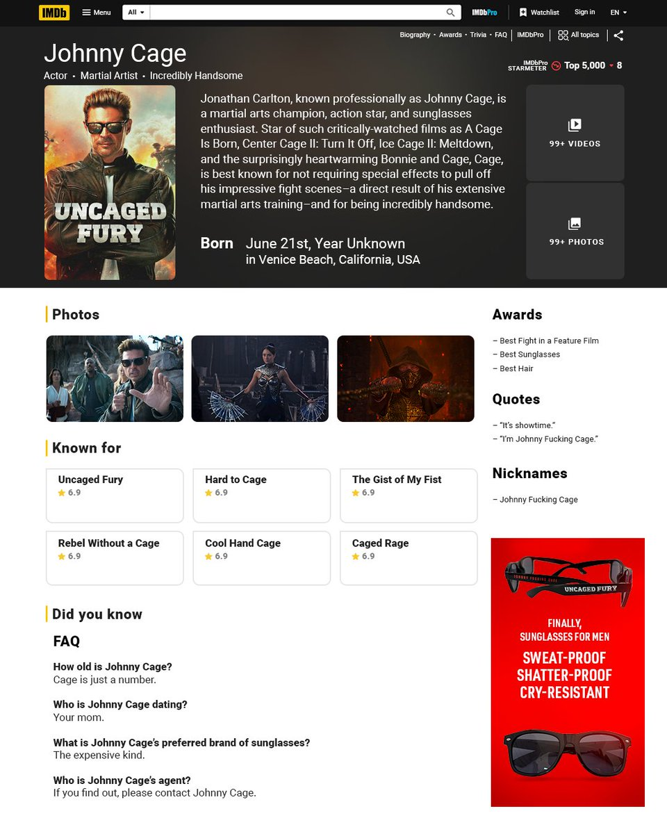 Cage channels his best Tom Cruise on another poster for Uncaged Fury -- one of the many theatrical masterpieces John Carlton (stage name Johnny Cage) lists on his fictional Internet Movie Database page, which can also be seen by scrolling below the Mission: Impossible inspired poster.