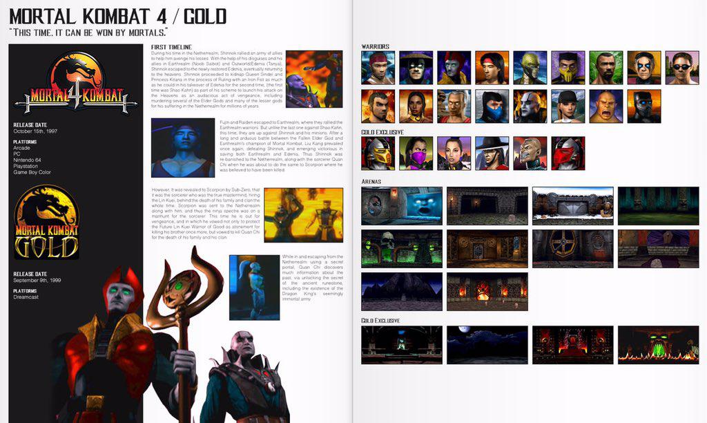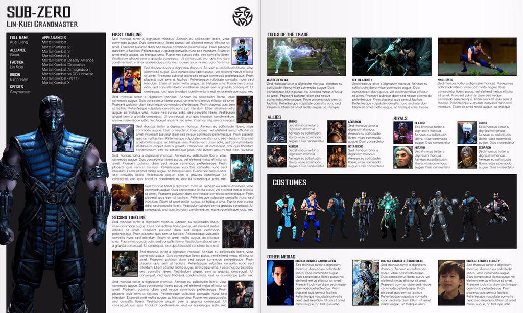 Earlier in the year, Snow provided MK Online with early drafts of the mock-ups that provide proof of concept for the book. The designs provide a hypothetical blueprint for DK Publishing, potential consumers, and the ultimate hold-out: Ed Boon and NetherRealm Studios. Click to enlarge examples below:
