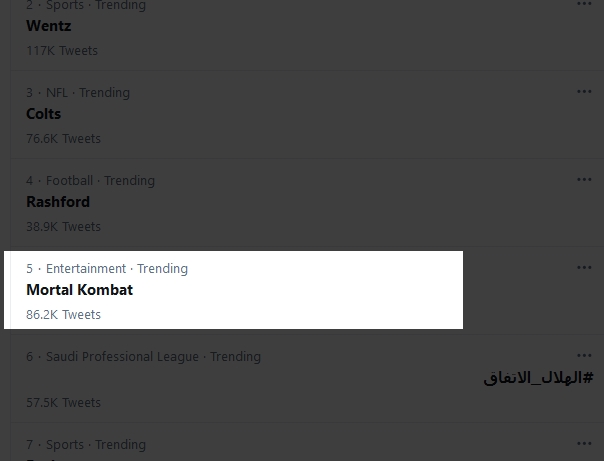US political scandal topped the list, with Mortal Kombat contending with various sporting codes for the Top 5 spots. Pictured at the 5th highest subject [above]; MK reached at least 4th in the Twitter algorithm's most discussed topics. This is distinct from the tailored "Trends For You" recommended to users based on preference.