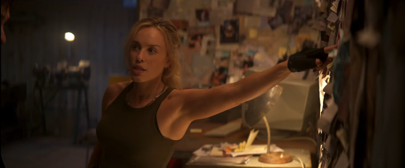 Australian actress Jessica McNamee is front and centre in a very Sonya appropriate green tanktop, pointing to a research board emblazoned with the name of the movie. She can be heard dramatically referring to an "invitation to Mortal Kombat" -- something she apparently knows a lot about.
