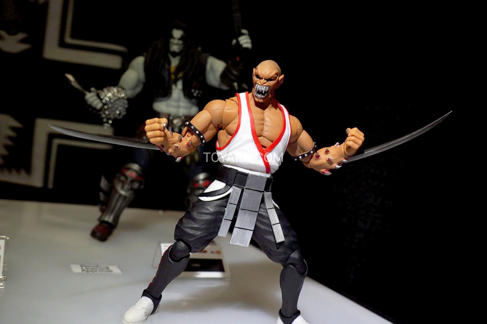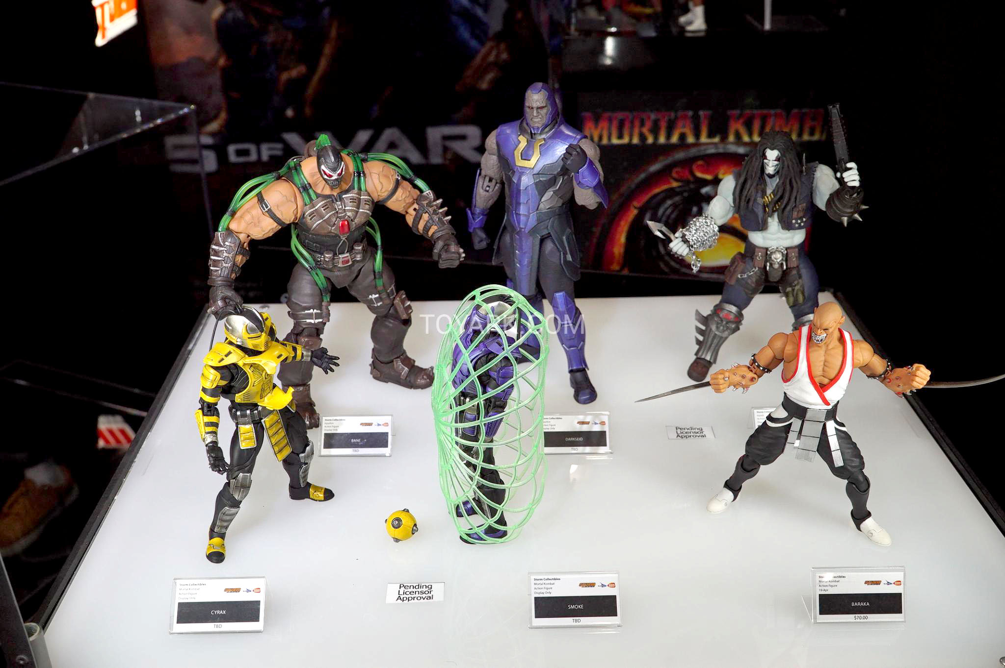 Toyark was in NYC to take extensive photos from the Storm display, where 1:12 scale figures of Baraka, Cyrax and a netted Smoke are joined by classic fighting game characters from Street Fighter and King of Fighters. Behind the MK offerings can also be seen Injustice versions of Darkseid, Bane and Lobo.