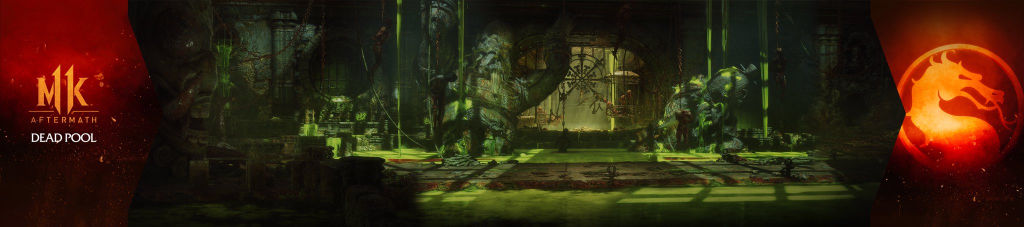 Just like The Soul Chamber; the returning Dead Pool has a completely new look for MK11. The modern Dead Pool is a dank and uninviting space cast in shadow, but still bathed in the familiar green glow of a flowing acid lake. Burnt corpses hung from chains remain a decorative standard for the space, with more elaborate architecture and flowing streams of acid running from the ceiling.