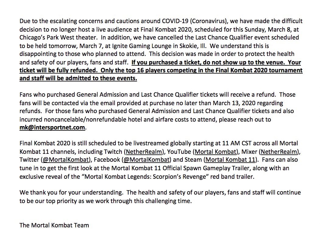 NetherRealm Studios issued an online statement Friday night via social media platforms [pictured below], offering a full refund on General Attendance and Last Chance Qualifier tickets. Attendees who incurred non-refundable hotel and airfare expenses can also seek compensation by contacting organizers at mk@intersportnet.com.