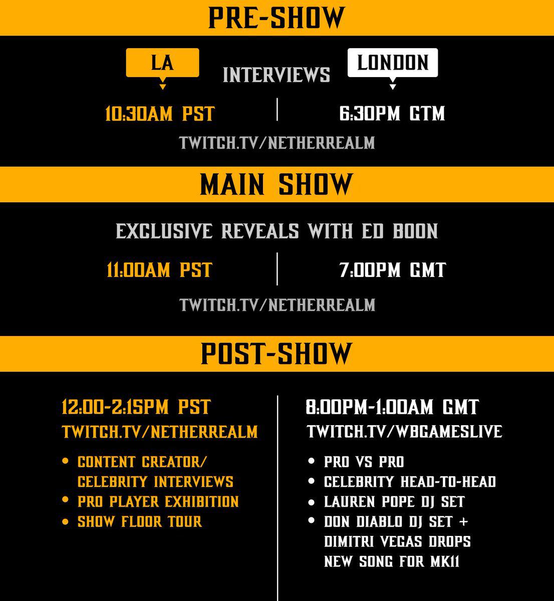 Pre-game hype kicks off across international timezones at 10:30AM PST and 6:30PM GMT. Then NetherRealm Creative Director Ed Boon will give fans the reveal they've been waiting for starting 11:00AM PST and 7:00PM GMT. Both locations will then offer bonus material, with hotly anticipated celebrity guests like Ronda Rousey and Xavier Woods, as well as live music from Dimitri Vegas and DJ sets by Lauren Pope, and Don Diablo!
