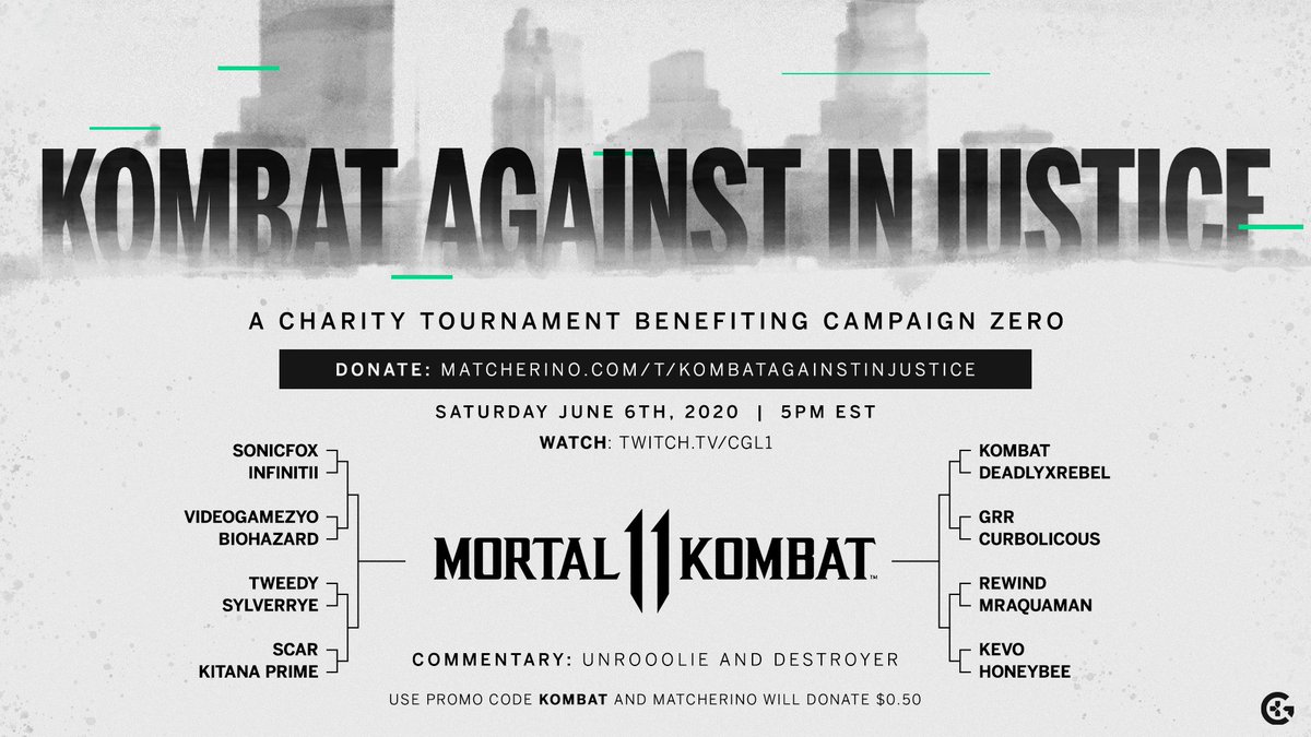 The action will stream live to Twitch on Saturday, June 6th starting at 5:00PM EST, with a $1,000 prize purse provided by Console Gaming League to go to the charity of the Top 4 finalists choosing. Additional donations from the public will go to Campaign Zero: an advocacy group campaigning for data-driven policy solutions to reform policing practises in the United States. Use the promo code Kombat when donating to Kombat Against Injustice and Matcherino will contribute $0.50.