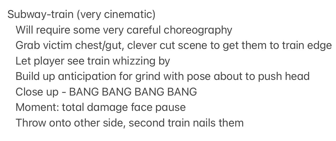 The notes roughly describe what became the new Subway stage fatality, where players will grab their opponent by the throat and walk them to the platform edge to thrust their head into the path of the train. After banging against each oncoming car, the loser is then tossed into the background to be swept away by another train.