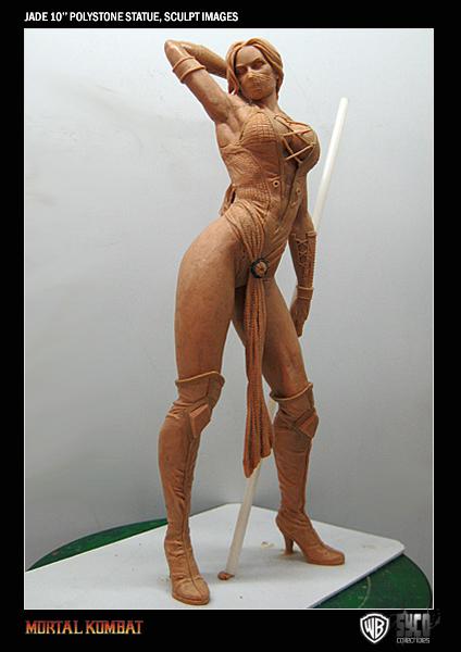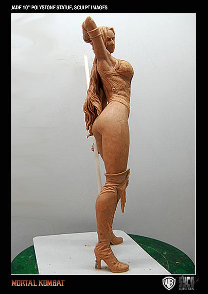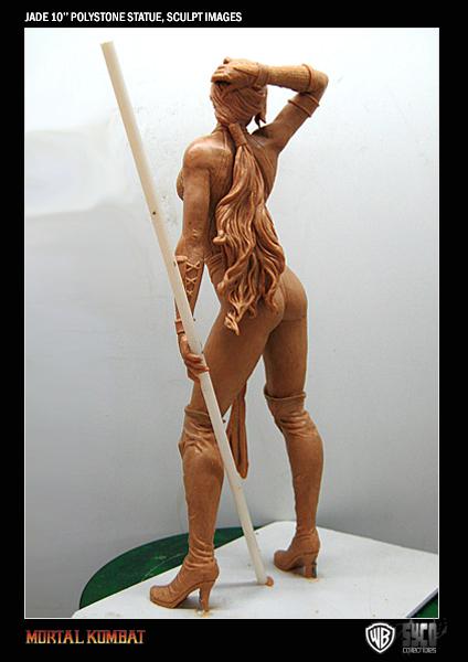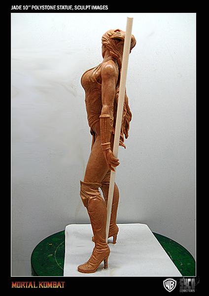 To coincide with Kitana, we can also exclusively reveal the in-progress, unpainted sculpt of the Edenian Renegade, Jade! Her final design will feature real chains attached to her costume and it has yet to be decided whether her trusty Staff will feature fluorescent neon paint or will be a clear staff with an LED light running through the center.