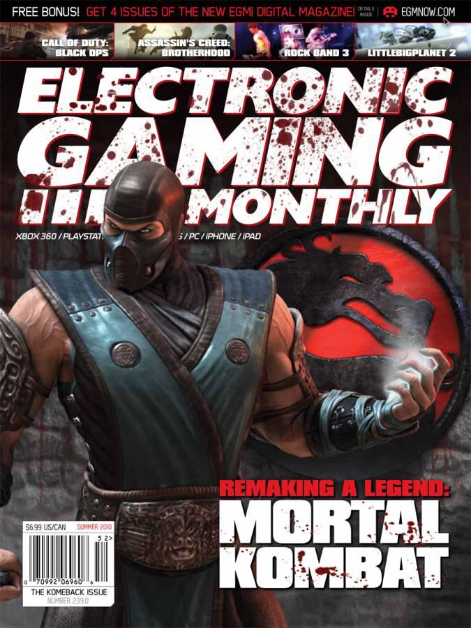 One of Mortal Kombat's poster boys, Sub-Zero, stands menacingly in a classically themed attire as the Mortal Kombat dragon logo rests in the background. Accompanying this is the blood-spattered text Mortal Kombat: Remaking a Legend. This issue of EGM is also cleverly titled "The Komeback Issue". These clues seem to hint that the upcoming game titled simply Mortal Kombat will be a remake or reboot of the series, rather than a continuation of any existing storyline. Though there appears to be no exact release date announced yet, Summer 2010 is listed and we will be keeping a close one on this developing story to bring you news of the game's appearance inside the magazine.