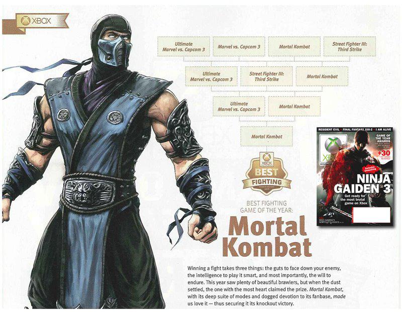 Tonight marked a big win for Netherrealm Studios, as Mortal Kombat took home the award for Best Fighting Game at the 2011 Spike Video Game Awards, beating out King of Fighters XIII, Marvel Vs. Capcom 3, and WWE All Stars. This is not the first major award the game has been awarded; It was also the recipient of Best Fighting Game of the Year at the 2011 Golden Joystick Awards [Full story], and crowned 'Fighting Game of the Year' by the Official US Xbox Magazine: