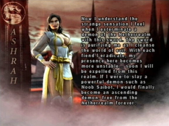 Noob Saibot was not originally a demon, which might explain why Ashrah sensed such great evil in him: He had to earn his place in the Netherrealm. He actually desired to remain there. His companion, however, seemed to be having a problem adjusting. Perhaps there was some good left in the cyborg. Whatever the case, Noob would have to face Ashrah alone. Ashrah defeated Noob Saibot and finally earned her ascension from the Netherrealm. But the sword that made her escape possible did not travel with her. I suspect it still remains in the Netherrealm, waiting to release another of its denizens from damnation.