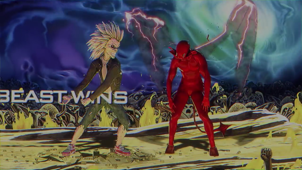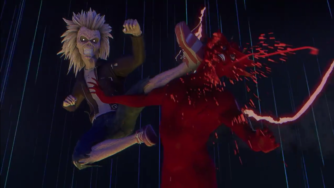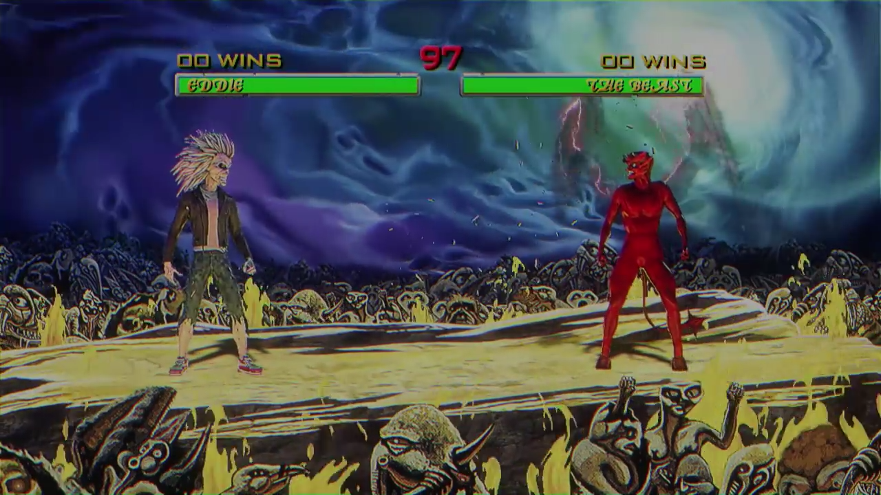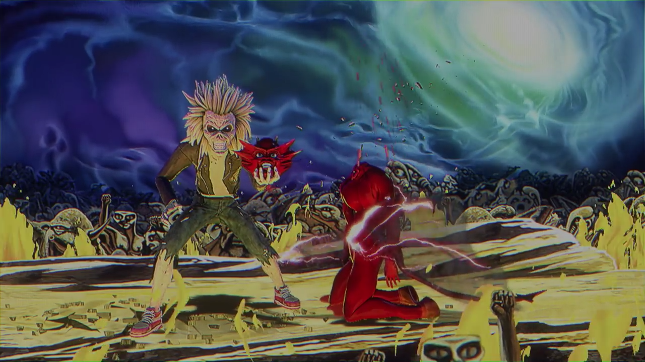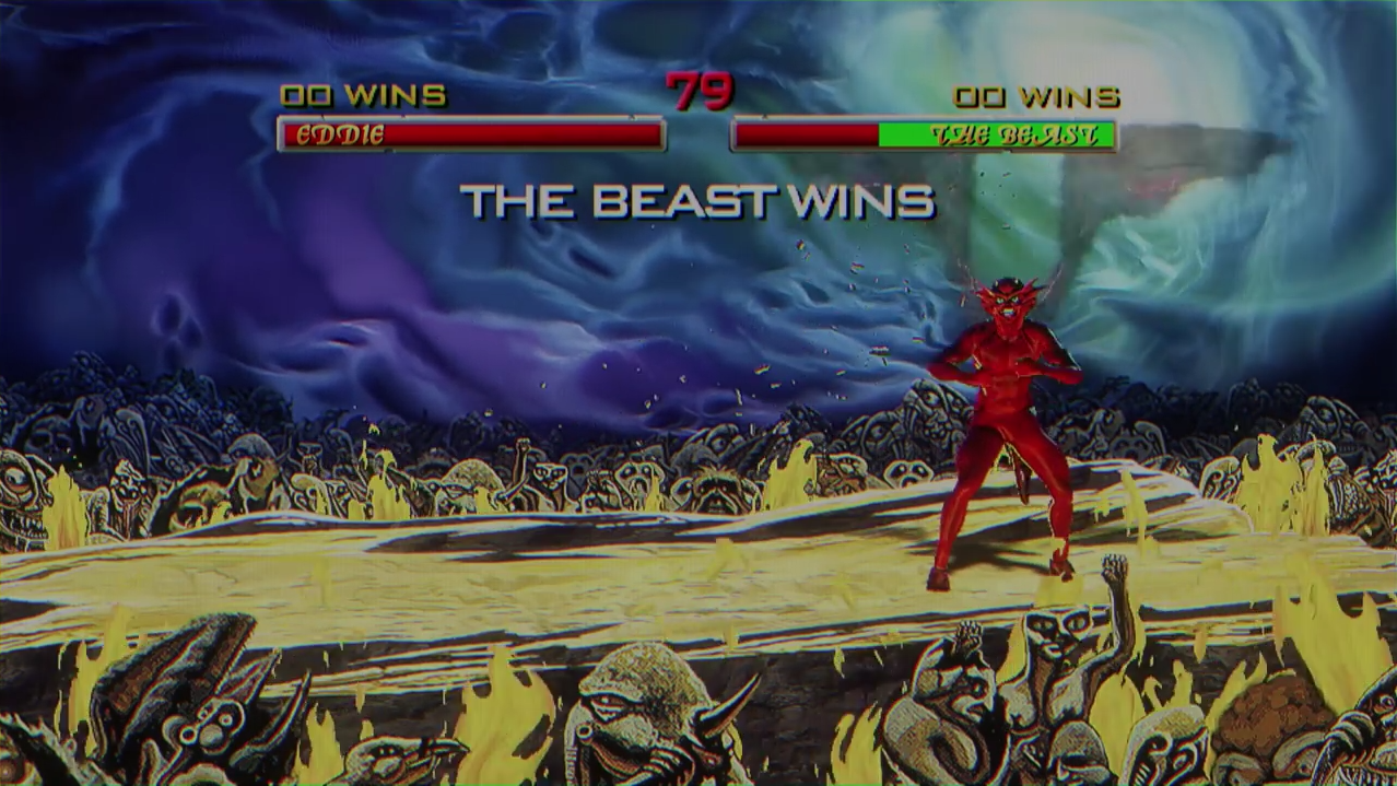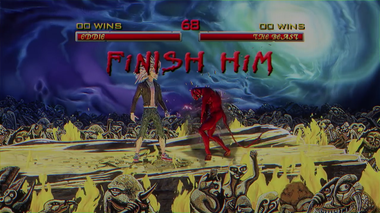 In Speed of Light; Eddie heart rips his way from basic pixelated platforming, to gun toting, and a one-on-one kombat style face-off with The Beast -- red devil made famous by Derek Riggs' artwork for the band's landmark 1982 album: The Number of the Beast. Not content with simply fighting side-to-side in the style of Mortal Kombat II - Eddie unleashes a cinematic aerial attack reminiscent of NetherRealm Studios' more recent efforts, such as super-moves found in: Injustice: Gods Among Us. The sequence ends fittingly, from "FINISH HIM!" to decapitation fatality. A reminder that Ed The Head always pulls the strings as the true puppet master.