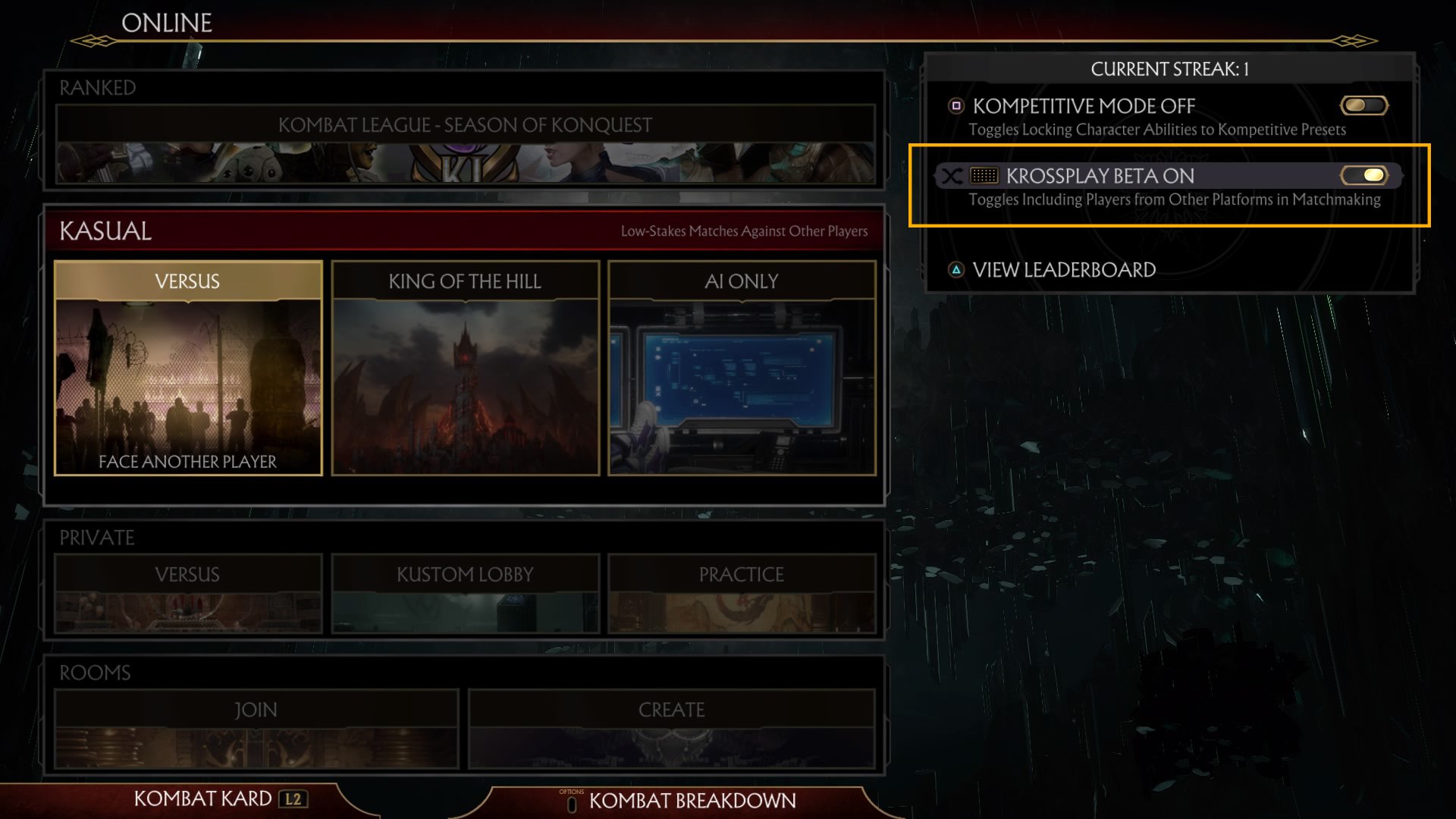 You can encounter players from the opposite console by activating the Krossplay Beta toggle in your Online options [pictured above]. This will allow you to enter dedicated Krossplay Online Rooms, and encounter players on both consoles during Online Kasual matchmaking. Krossplay online players will be indicated with a crossed arrows icon.